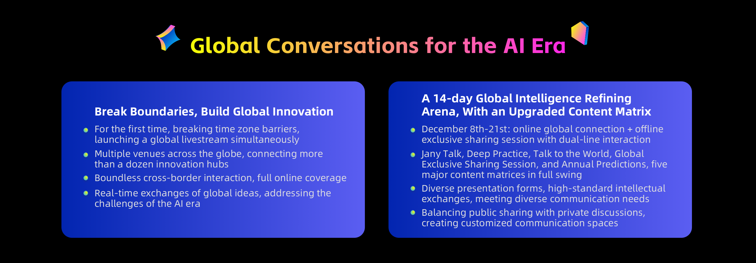 - 12 /8Opening DayAI Blooming EraLivestreaming:Dec.810:00-10:50 【Jany Talk】「How Humanity Can Survive in an Al-Driven World」Guest speaker:Geoffrey Hinton:Fellow of the Royal Society, Recipient of the 2018 ACM A.M. Turing Award, and Winner of the 2024 Nobel Prize in PhysicsModerator:Jany Hejuan Zhao: the Founder and CEO of NextFin.AI, the Founder, Chair & CEO of TMTPost Group and the Publisher of Barron’s China