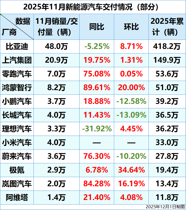 新能源汽車11月交付情況速覽:9家交付量超3萬,4家同比增超50%
